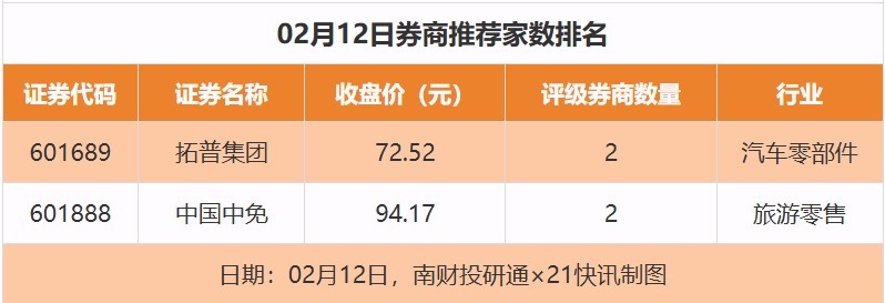 从券商推选派系来看,2月12日有20家上市公司得到券商推选,其中拓普集团、中国中免各赢得2家推选,皖维高新等赢得1家推选。
