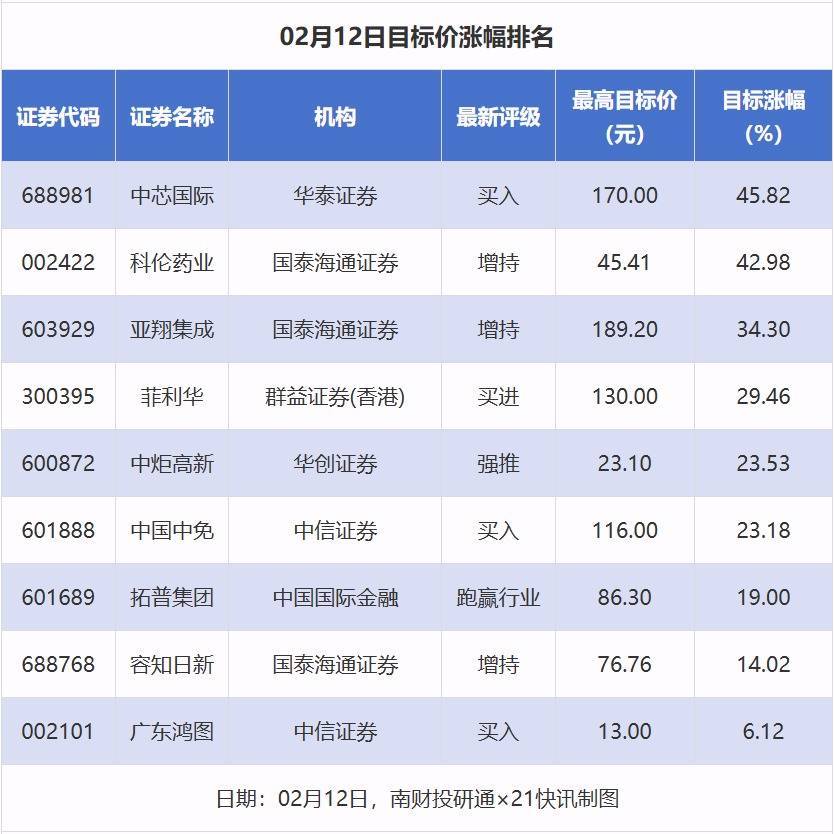 南财投研通数据透露,2月12日,券商赐与上市公司规划价共9次,按最新收盘价筹算,规划价涨幅排行居前的公司有中芯国外、科伦药业、亚翔集成,规划价涨幅诀别为45.82%、42.98%、34.30%,诀别属于半导体、化学制药、专科工程行业。