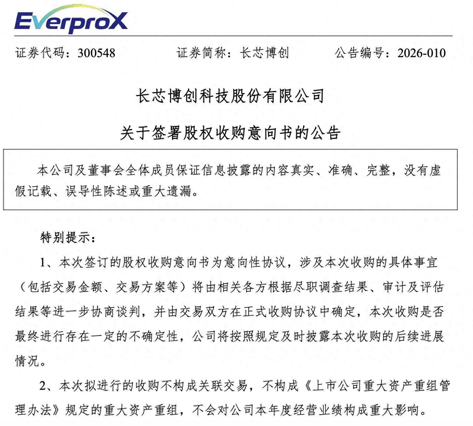 2月24日,长芯博创(300548)公告称,公司于当日与上海鸿辉光通科技股份有限公司(简称“乙方”)就乙方抓有的上海鸿辉光联通讯本领有限公司(简称“丙方”或“磋磨公司”)坚硬了《对于上海鸿辉光联通讯本领有限公司的股权收购意向书》,就公司拟收购乙方正当抓有的磋磨公司93.8108%的股权达成初步意向。