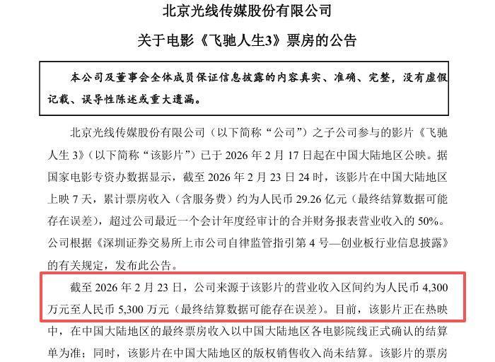 A股方面,光辉传媒(300251.SZ)发布的公告线路,收尾2026年2月23日,公司开端于《驰骋东谈主生3》的买卖收入区间约为东谈主民币4300万元至东谈主民币5300万元(最散伙算数据可能存在舛误),开端于《惊蛰无声》的买卖收入区间约为东谈主民币520万元至东谈主民币660万元(最散伙算数据可能存在舛误)。